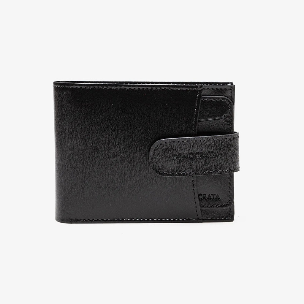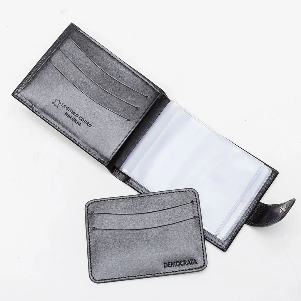 Carteira confeccionada em couro, na cor Preto. Parte interna com 4 divisórias para cartões, 1 divisória para moedas,1 compartimento interno extra, e 1 abertura total para cédulas.Dimensões: 10,5cm x 8cm